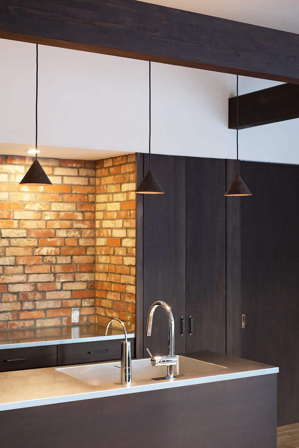 キッチン壁面に使った古レンガのルーツが興味深い。