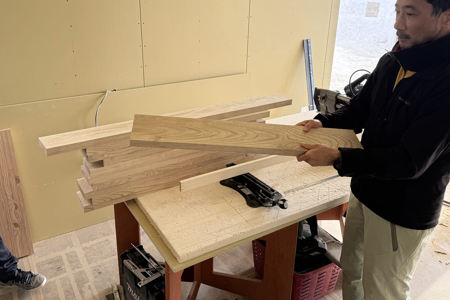 道南 知内(しりうち)の工場で作られている北海道産の広葉樹フローリングのカットサンプルを見ていただいて、そのうちの「クリ」を選びたいという施主さんの意向がまずありました。